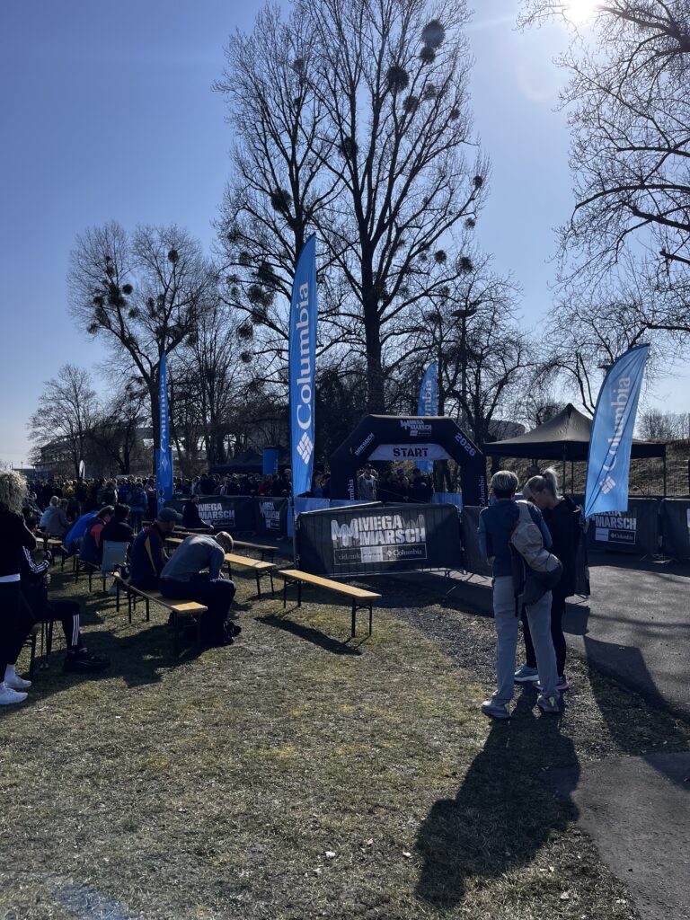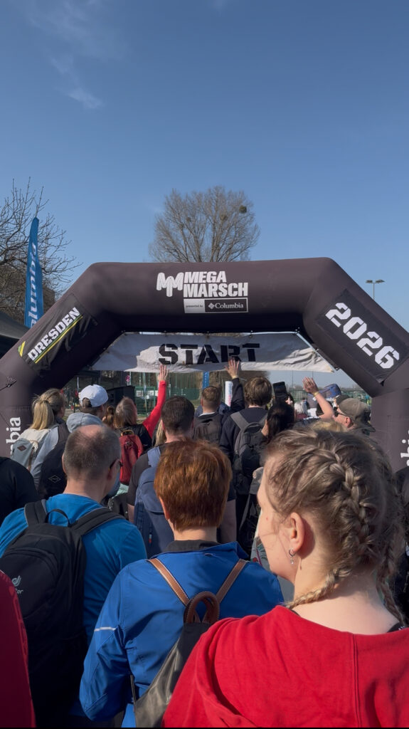 Mit Startbändchen ausgestattet, die man neben einem Wanderheft und einen Aufkleber erhielt, reihten wir uns in die Schlange der Wartenden unterm großen Startbogen ein, auf dem die Worte Megamarsch prangten.